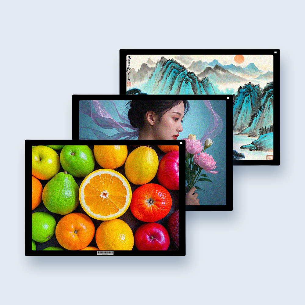 13.3 inch Spectra 6 full color ePaper photo frame, supporting mobile phone app to transfer pictures to the device via BlueTooth, supporting automatic slideshow or manual mode, built-in Li battery, Type C for charging.