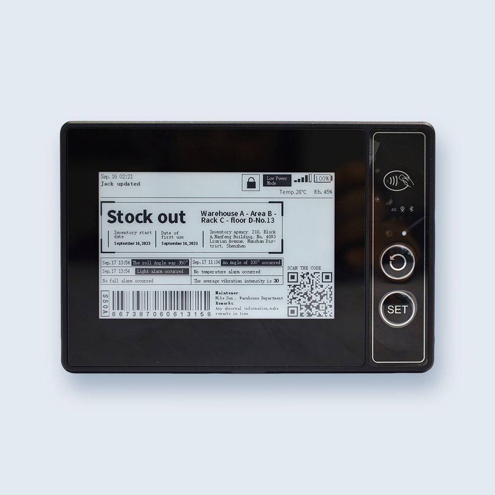 4.01-inch black-and-white 4G logistics ePaper Sheet/Waybill. It integrates GPS/Beidou positioning, a vibration sensor, a temperature and humidity sensor, two light sensors, etc.. It supports various configurations to monitor the entire transportation process. The cloud platform provides visual presentation to achieve digital management of the transportation process.